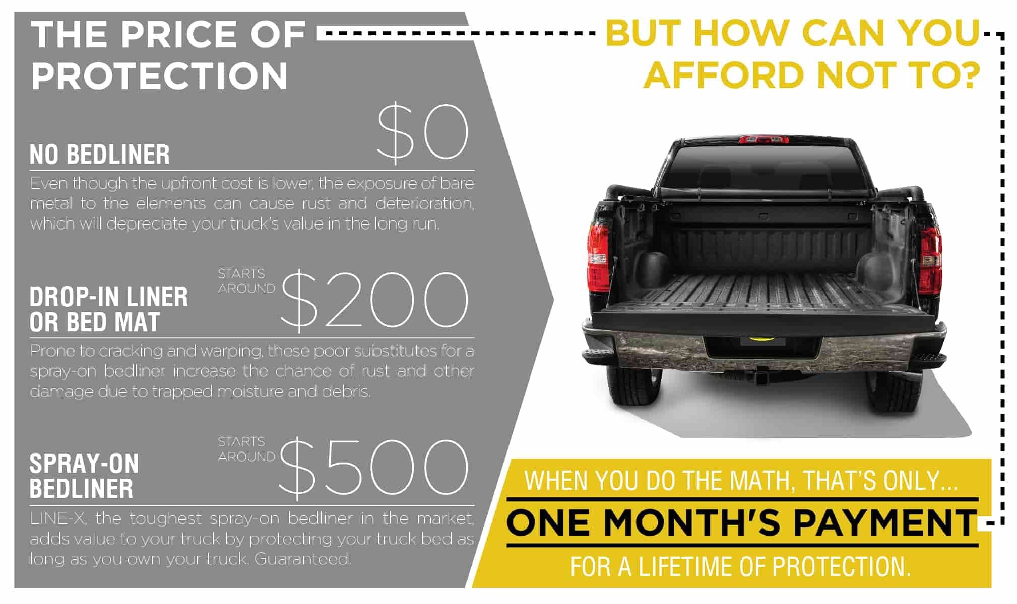 Custom coat black 1 gallon urethane spray on truck bed liner kit with spray gun and regulator easy 3 to 1 mix ratio just mix shake and shoot it professional durable textured protective coating. Protecting and preserving your brand new truck is something every owner thinks about. 450 inclusive of all the parts and installation. A truck bed liner will prevent against scuffs and scratches which will come at an extra cost for you to fix down the line anyway.